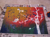 Then I put an extra layer of different colored paints to give a to give the painting more dynamic. I following up with splattering of blue paint.