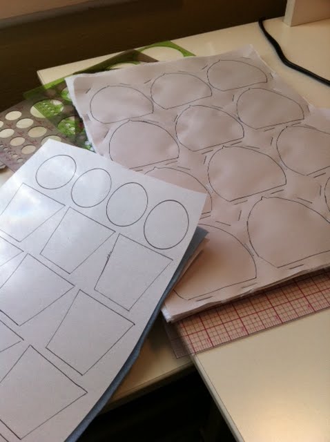 Trace out your pattern per color felt on a sheet of newsprint (while still leaving newsprint paper in pad) leaving enough space between tracings for stapler to fit between. Once tracing is complete, rip out the traced sheet and the sheet underneath the traced sheet, so you will have 2 sheets of newsprint.